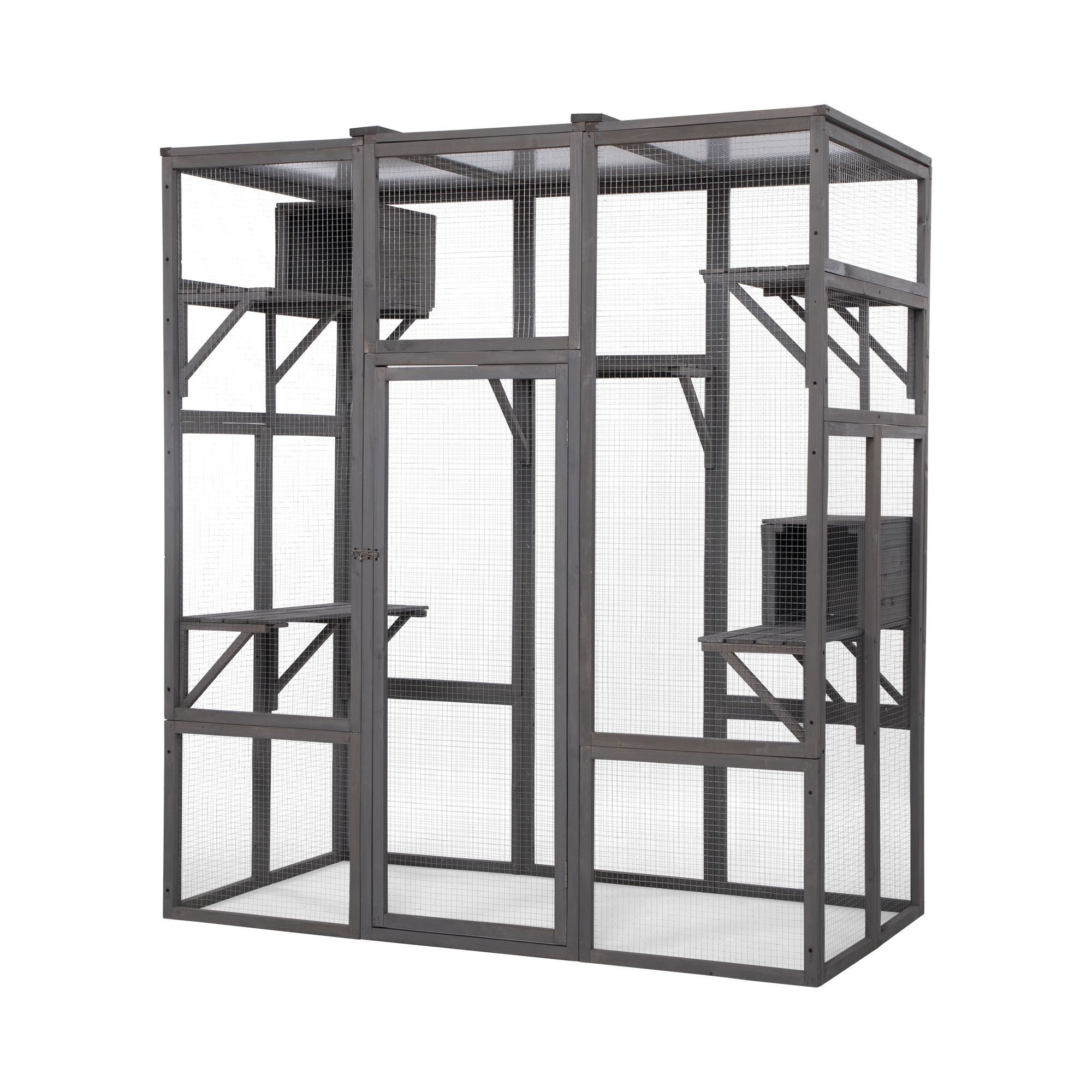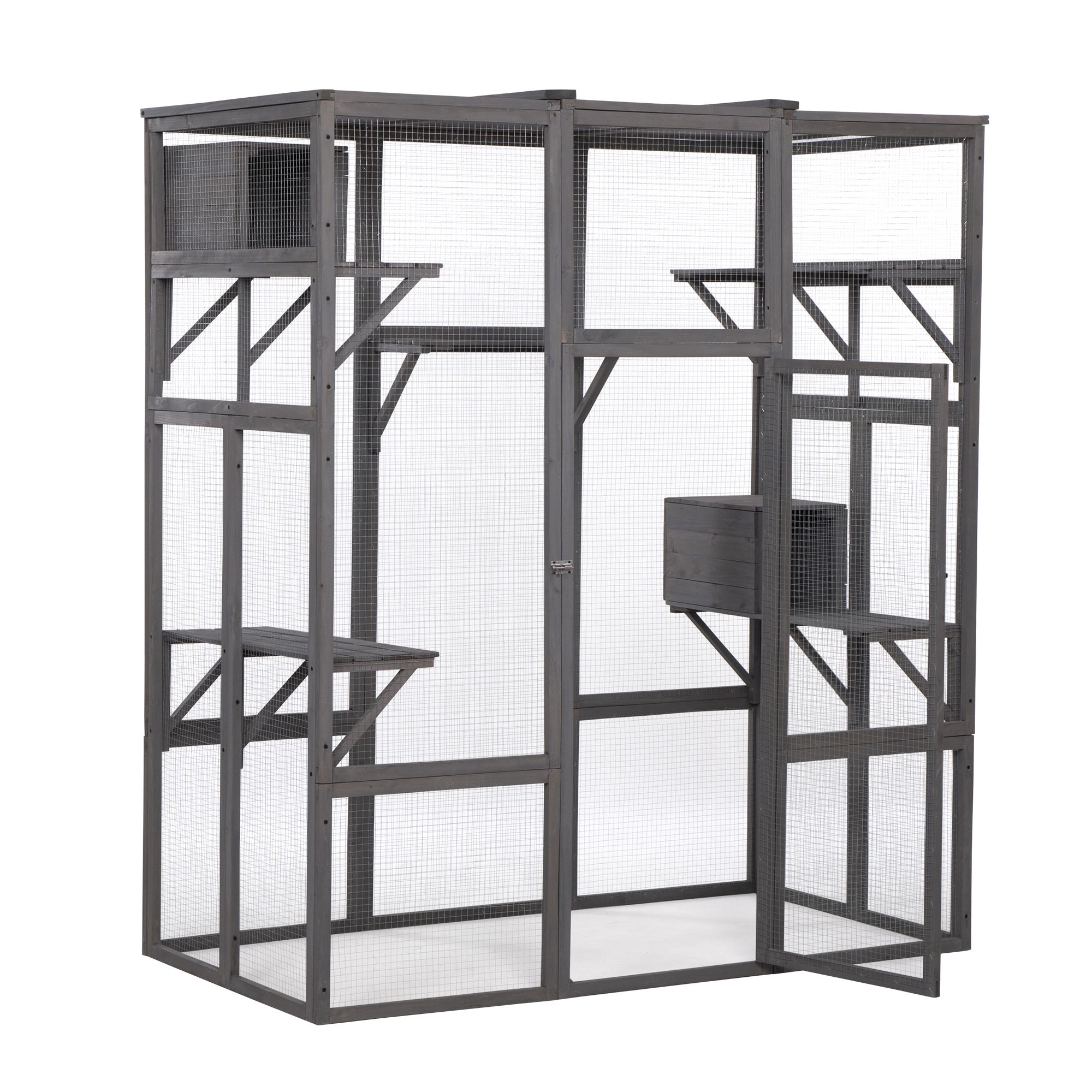 Specifications:Color: GrayMaterial: Fir + Galvanized Mesh + Hollow SheetOverall Dimensions: 62.41"L x 32.36"W x 70.08"HDoor Dimensions: 51.19"L x 20.87"WPlatform on the Left and Right (each): 30.52"L x 9.84"W x 0.71"T(thick)Platform in the Middle: 20.87"L x 9.92"W x 0.71"T(thick)Cat Condo(each): 15.08"L x 9.37"W x 9.84"HHollow Sheet Dimensions: 31.5"L x 19.29"W x 0.31"T(thick)Net Weight: 63.9 lbsThe product includes a set of fully English instruction manuals