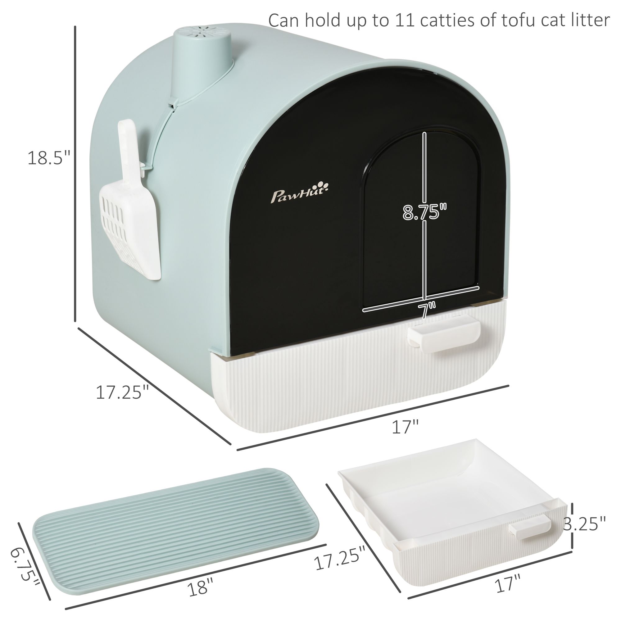 • - Cat Box Info: Overall Dimensions: 17" L x 17.25" W x 18.5" H. Tray Dimensions: 17" L x 17.25" W x 3.25" H. 15" L x 13.5" W x 3.25" H (Inside). Flap Door Size: 7" W x 8.75" H. Suitable for small cats and kittens under 10 lbs. Assembly required.